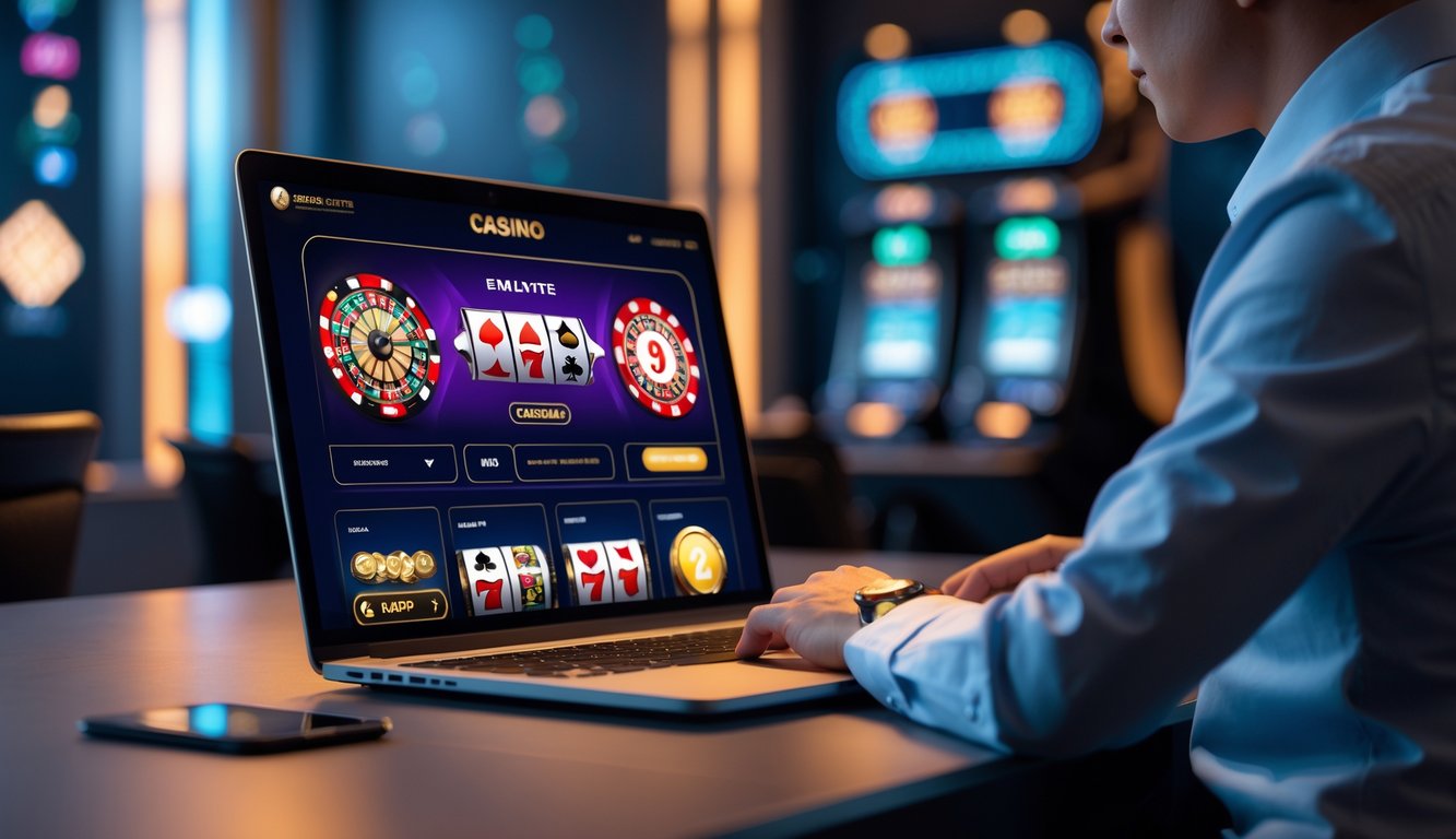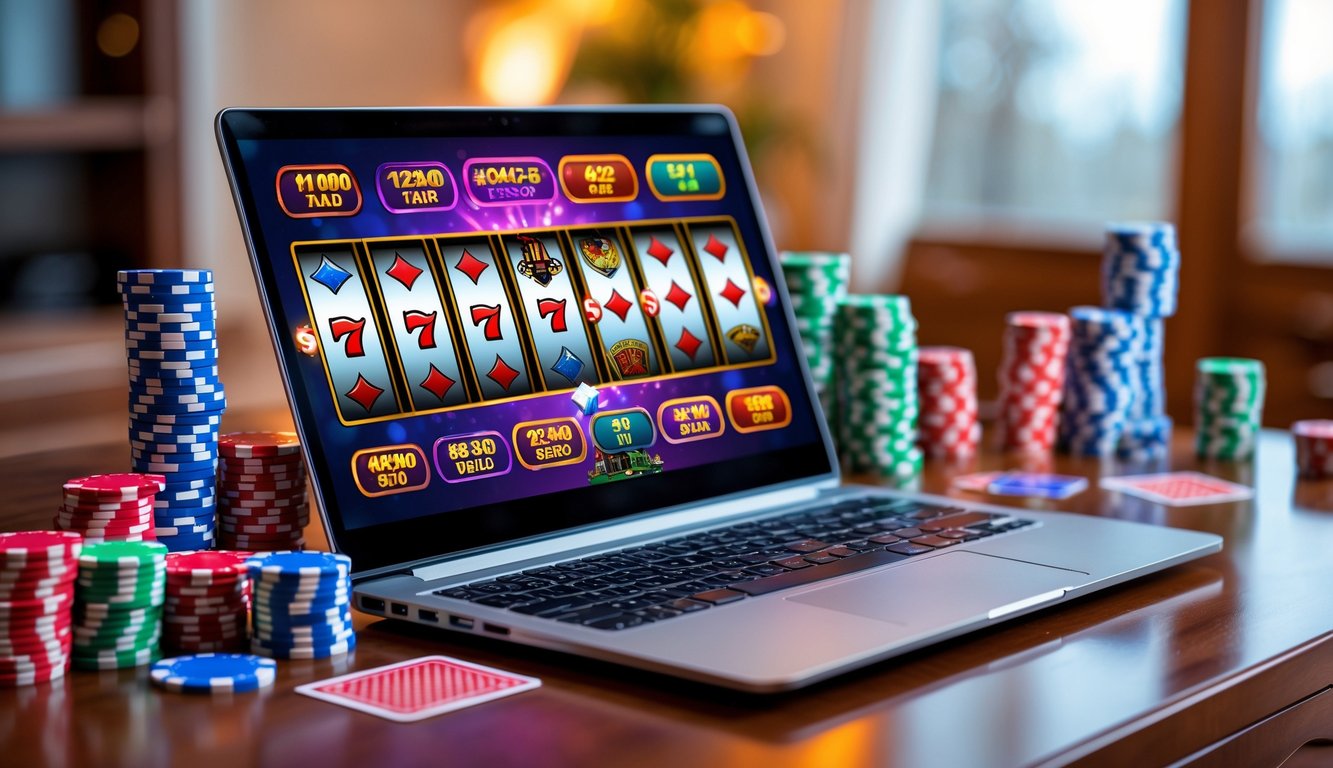 Sebuah laptop menampilkan antarmuka platform judi online dengan ikon permainan kasino di sekitarnya di atas meja kerja modern.